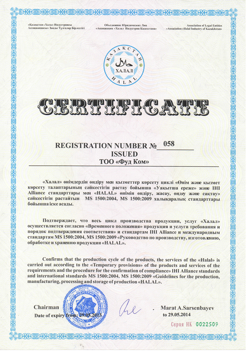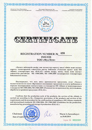 А так же, раз в год компания Фудком проходит сертификацию стандарта "халал" проводимой Объединением Юридических Лиц "Ассоциация "Халал Индустрия Казахстана".