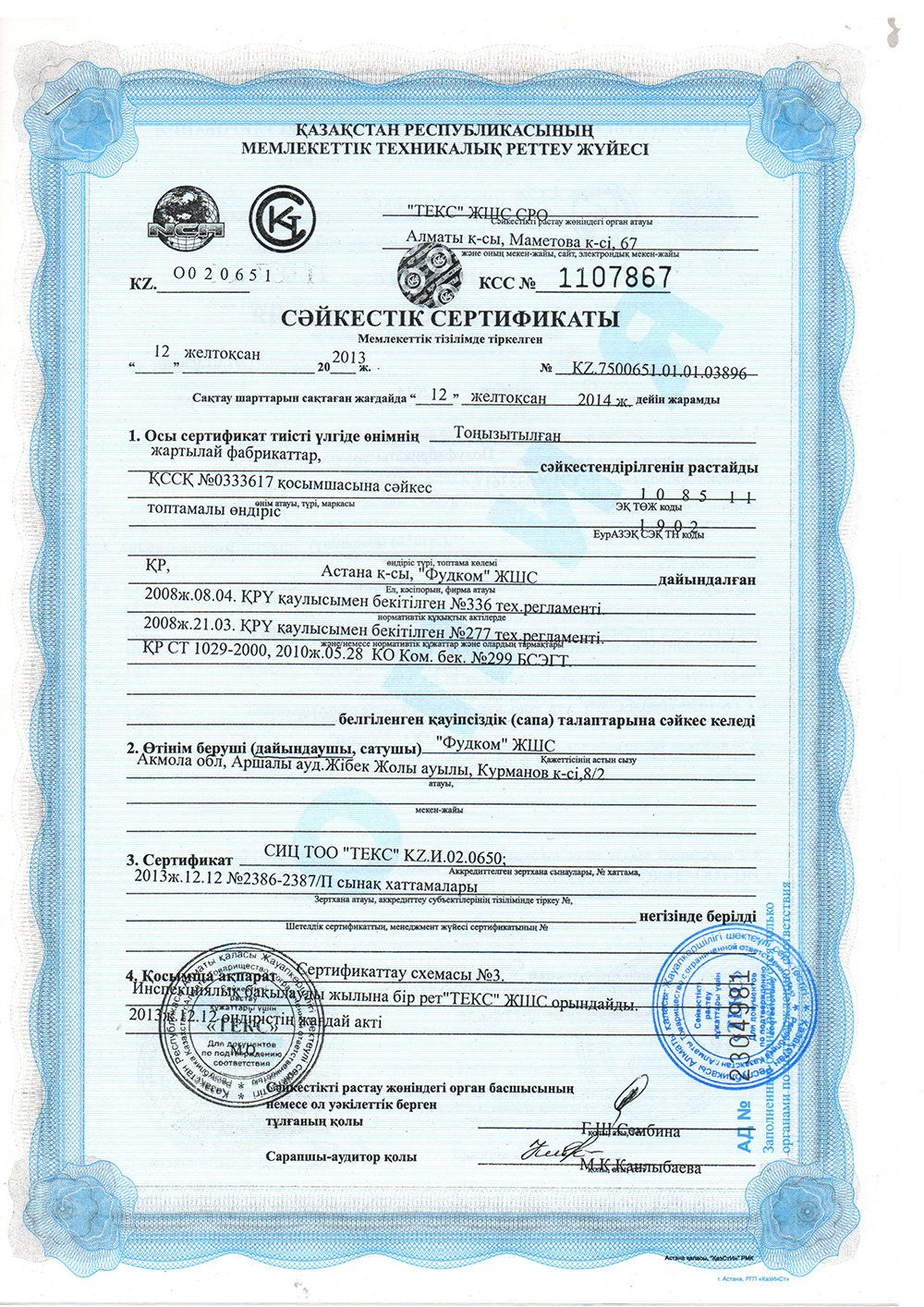 Каждый год компания Фудком проходит сертификацию на соответствие Государственному Стандарту РК (1029-2000).